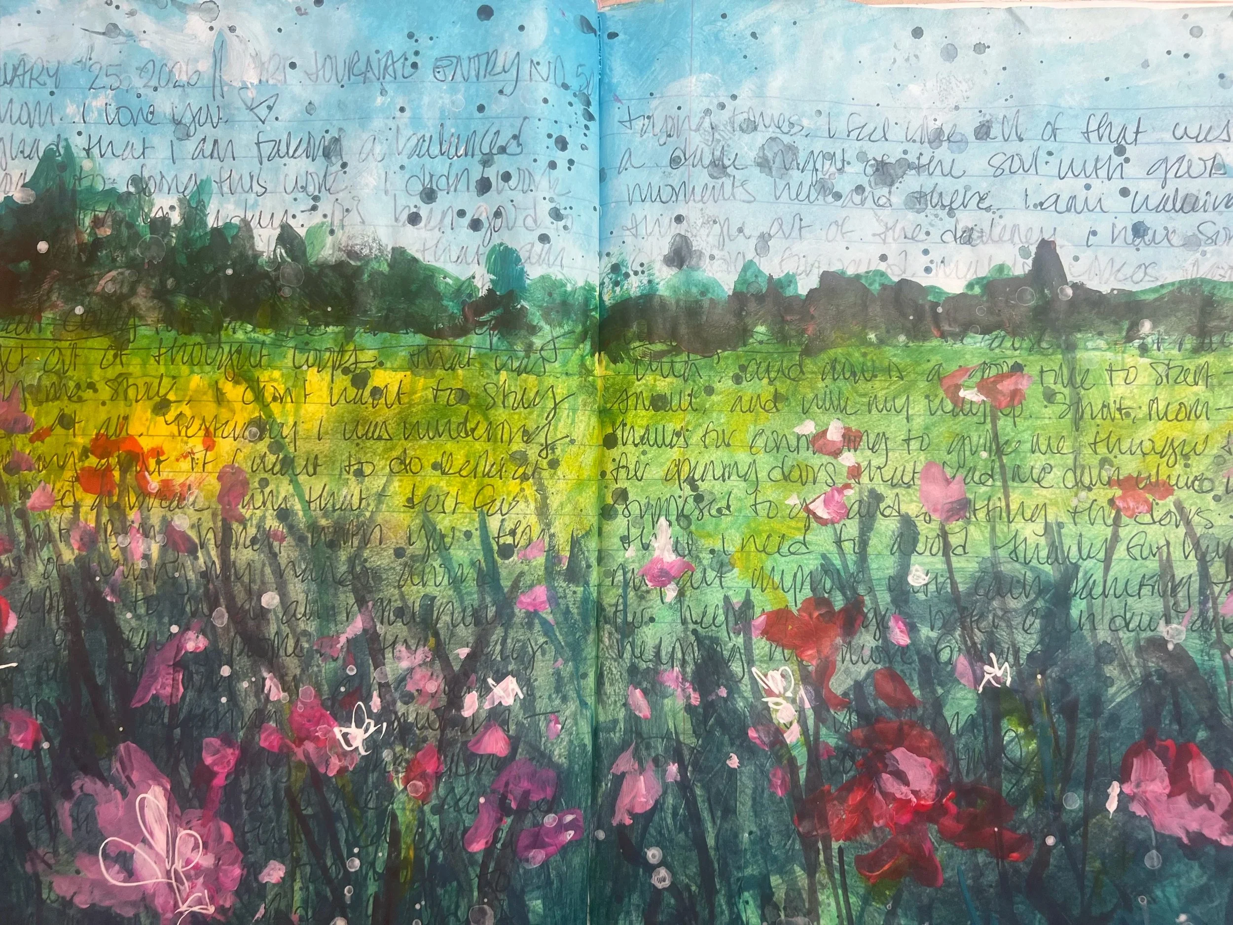 Today’s page is a field of flowers. I built it in layers, sky, a soft tree line, and the field behind the flowers. I love painting this way, letting drips happen on purpose and not forcing clean, defined details. It can feel like I’m scribbling with a paintbrush, and somehow it comes together. I lose track of time in the act of making.